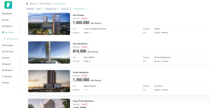 Search listings based on developers, areas, communities and different filters